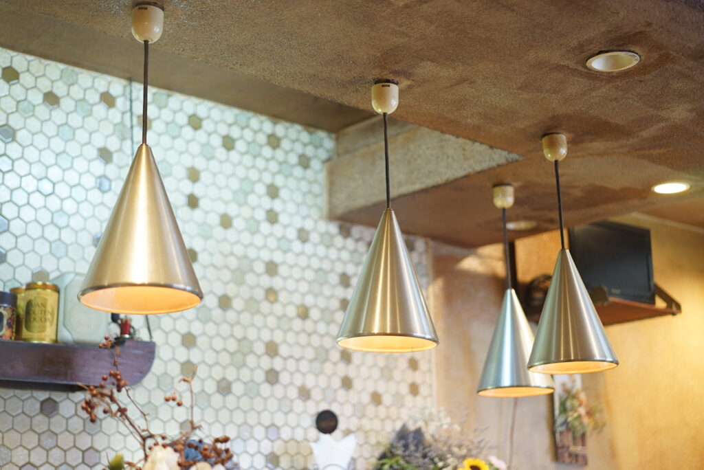 シルバーの円錐型が特徴的なペンダントライト、